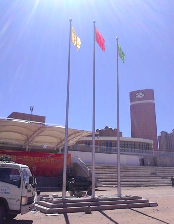 3、目前國內企業一般為三根旗桿,三根旗桿高度不一樣,主旗桿(升國旗)16米-18米、另外兩根低于主旗桿800毫米,一根升企業主管局的旗幟,一根升企業的旗幟;假如您的企業為中外合資,那么主旗桿升國旗,左邊升合作國家的旗幟,右邊升主管局的旗幟(也可以升自己企業的旗幟)。